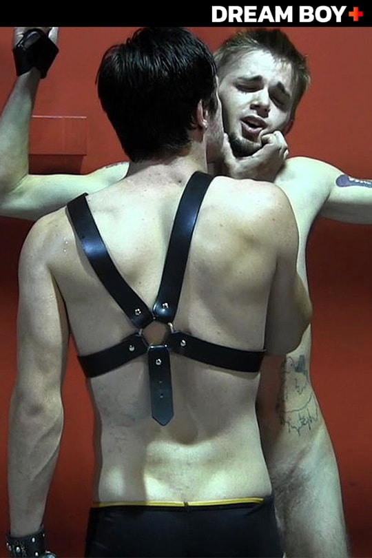 Logan has turned the tables on his former Master, capturing the boy by surprise and binding him to the bondage table with rope. “How do you like it?” The stud mocks his new slave, smacking him across the face. Then, the boy is moved to the next bondage station where he’s cuffed by his wrists and smacked viciously with the leather flogger. “Please!” Joshua begs, struggling against his binds. Just when things look like they couldn’t get any worse for the slave, Master Logan straps a collar around the boy’s neck, shoving him down to the ground just like the dog that he is.