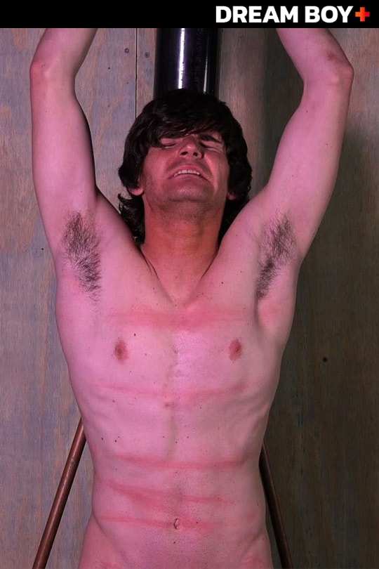 After a fresh back and ass single-tail whipping, lean stud Riley is flipped around, arms roped high above to the bondage pole, legs spread, chest and abs fully exposed. Rope man J.J. proceeds to match front to back, striping Riley’s chest, abs, and just above that pretty cock bright red. J.J. then gets Riley hard, followed by another series of lashes. Riley’s arched torso looks mighty fine banging against the bondage pole as his smooth skin is painted up and down.