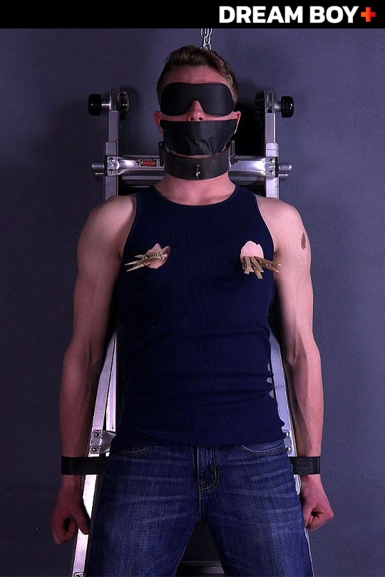 Innocent, young Noah is completely naked and helpless, spread-eagled on his back, blindfolded and alone. Well not completely alone. Jared is always with him, watching his smooth, flawless body tremble and flex, enjoying the look of fear and horror on his boyish face. “Ohhhhh,” Noah moans as he feels Jared’s greasy hand stroke his cock. Then the pain! A clothespin is snapped on his ball sack! “Aghhh!” he screams. Then another and another! It hurts, but the stroking continues and Noah’s cock gets hard despite the pain. Then a pin is snapped onto his erect cock! Then another – and several more. Then one goes right on the tip of his cock! The pain is terrible. Then he feels himself being stretched from all four corners of the table.